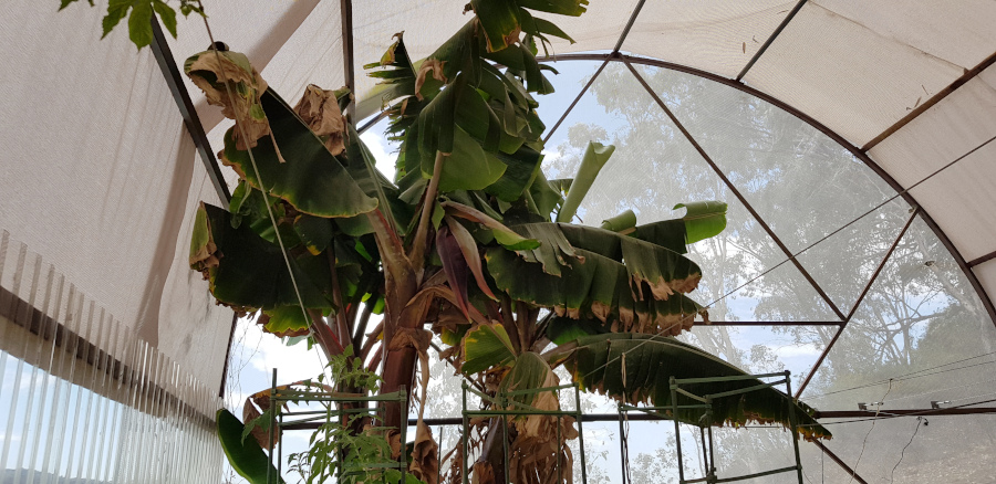 The original system constructed in 2013 consists of a buried 4500 litre fish tank (run at not quite full). This system has a ~2000 litre sump tank, with 9  500 litre grow beds, variously planted with silverbeet, parsley, celery, garlic, beans, asparagas, coriander, beetroot, cauliflower, broccoli, romaneso, spring onions, chives, ginger, turmeric, fennel, tamarillo, rhubarb, peas, tomatoes  (160kg picked between xmas 2013 and 17th July 2014 from 8 plants), strawberries, eggplant, capsicum, Egyptian walking onion (aka tree onion), and a dwarf Red Dacca banana that has become huge and multiplied.  Snow and heavy frosts in July-August 2015 really knocked the banana about for a few months, but by late 2015 it was looking healthy again.