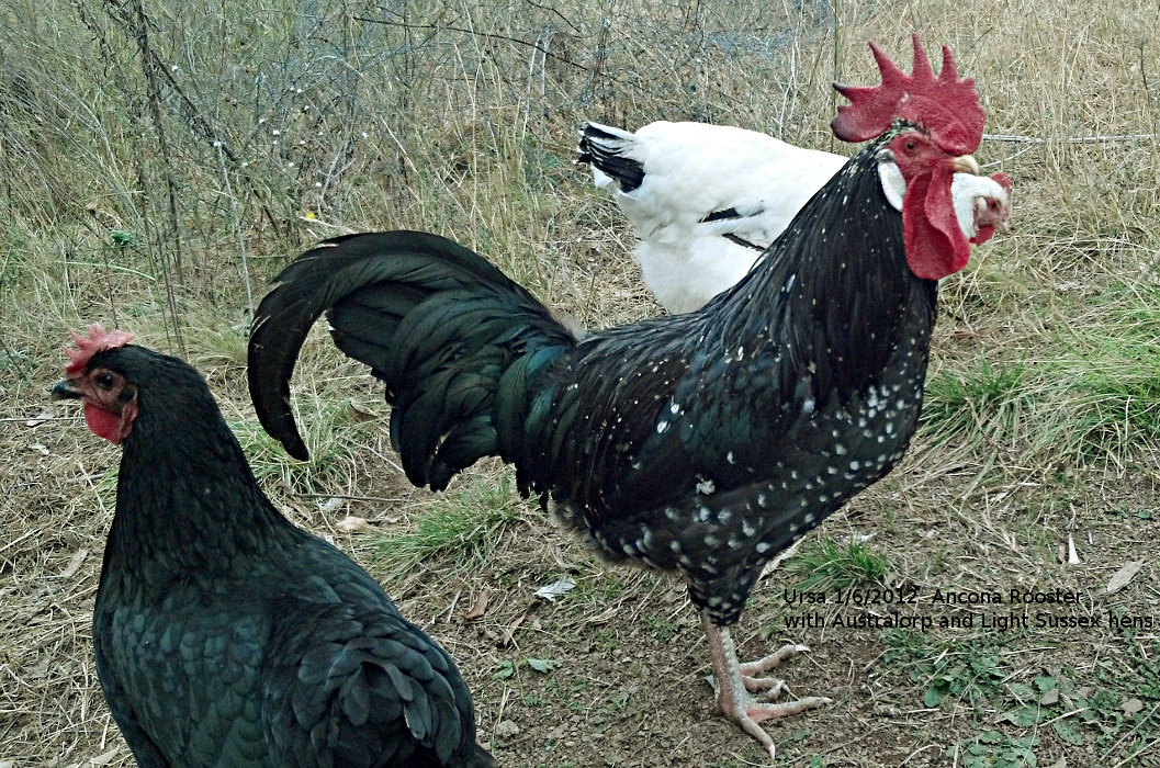 Chooks + Barney the Barnevelder rooster in the cherry orchard