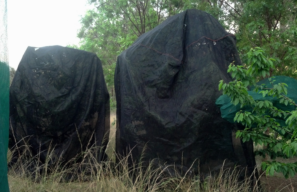 Shade cloth or fruit fly netting bags used to protect the fruit trees from Qld Fruit Fly and birds, 50% shade cloth bags over cherry trees in this view.