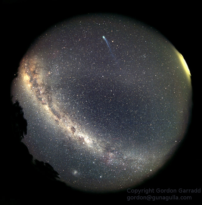 An All-sky photo showing the entire sky + horizon, with Comet Hyakutake near the bright star Arcturus, and also showing The Milky Way from horizon to horizon and Zodiacal Light, with Tamworth city lights on the NW horizon